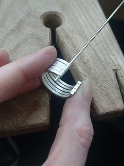 ![]() | ![]() | ![]() Cast silver bits after riveting and oxidizing; |